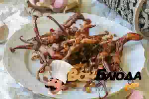 9. Когда все язычки будут готовы, высыпать в горячее масло весь оставшийся чеснок, слегка подрумянить. Посыпать обжаренным чесноком утиные язычки во фритюре. Хрустящие утиные язычки с чесноком по-китайски подавать сразу, пока они горячие.