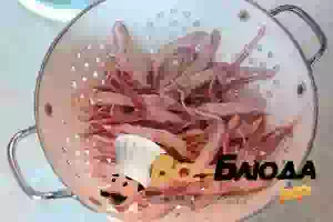 1. Перед жаркой утиные язычки промыть, сложить на дуршлаг и дождаться, когда с них стечет вода. Переложить язычки на бумажное полотенце, обсушить.