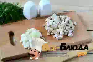 3. Луковицу мелко порубите, грибы порежьте на небольшие кусочки.