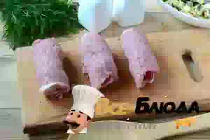 7. На каждый ломтик мяса положите примерно по 1 ст. ложке (без горки) начинки, заверните в рулетик.