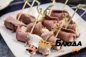 4. Закрепить края рулетика шпажкой для канапе. Всё, готово! Готовые рулетики из свиного языка с сыром и чесноком до подачи к столу убрать в холодильник.