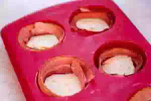 3. Поджаренным беконом выложить стенки формочек (по 2 ломтика на каждую), стараясь уложить их так, чтобы ломтики бекона охватили поджаренный хлеб со всех сторон.