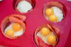 5. В каждую формочку вылить по 2 яйца. Посолить и запекать в прогретой до 180С духовке около 15 минут. За это время белок будет полностью готов, а желток останется внутри кремовым. Переложить готовые гнезда из бекона с перепелиными яйцами на тарелку, украсить зеленью и подавать на завтрак.