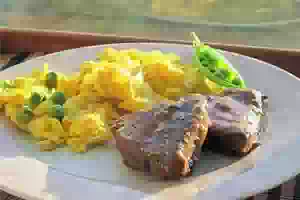 4. Сразу начинаем размешивать вилкой (лопаткой), жарим 30-40 секунд. Горячим выкладываем на тарелки вместе с кусочками печени.
