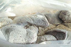 1. Печень нарезать на ломтики. Обвалять в пакете в смеси соли, кукурузной и пшеничной муки.