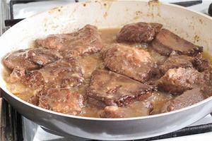 2. Быстро обжарить с двух сторон, добавить воды 2/3 стакана и тушить 5-7 минут под крышкой. В процессе готовки в сковороде из панировочной муки, масла и воды образуется загущённый соус.