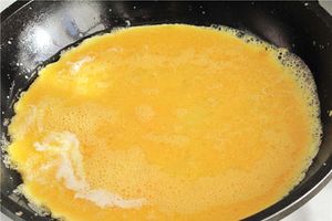 3. Пока готовится печень, берем 2-3 яйца, разбиваем, солим, выливаем на сковороду в разогретое топлёное масло.