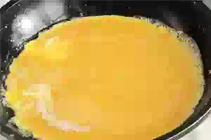 3. Пока готовится печень, берем 2-3 яйца, разбиваем, солим, выливаем на сковороду в разогретое топлёное масло.