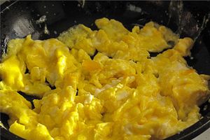 4. Сразу начинаем размешивать вилкой (лопаткой), жарим 30-40 секунд. Горячим выкладываем на тарелки вместе с кусочками печени.