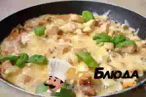 5. Залейте мясо и грибы сливками, немного прогрейте всё вместе.