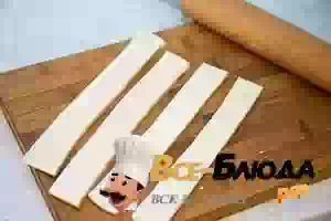 1. Слоеное тесто разморозить, не снимая с него упаковки. Пласт теста нарезать на 8-10 полосок шириной 2-3 см и длиной не меньше 15 см.