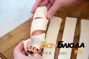 2. Очищенные от оболочки сосиски обернуть полосками теста по спирали, подогнув кончик теста так, чтобы он оказался под слоем теста.