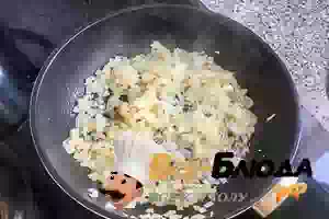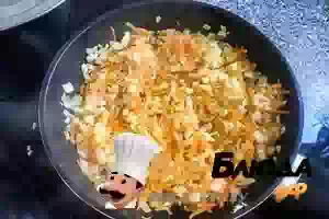 2. Пока жарится лук, натереть на мелкой тёрке небольшую морковку и столько же по количеству нарезать мелкими шашками белокочанной капусты. Добавить их к луку и потушить вместе почти до готовности.