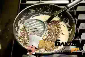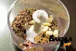 1. Немного подсушенных шампиньонов размалываем в блендере, потом немного орехов к ним.