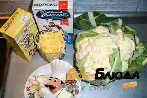 1. Капусту разобрала на соцветия. Тем в временем в кастрюльке на плите закипела чуть подсоленная смесь молока и воды 50/50. В ней и отварила капусту. Минут шесть вполне достаточно. Половину сыра смешала со сливками, мелко нарубленным чесноком, натёртым мускатным орехом.