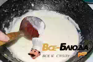 4. Для соуса растопить сливочное масло, добавить муку, обжарить до кремоватого оттенка, после чего тонкой струйкой, постоянно помешивая, влить молоко. Следите, чтобы не образовалось комочком. Добавить сметану (или майонез), дайте соусу закипеть, и сразу же добавьте тертый сыр.