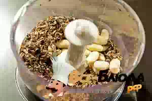 1. Немного подсушенных шампиньонов размалываем в блендере, потом немного орехов к ним.