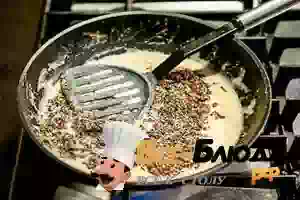 3. Заливаем бульоном, на слабом газу это превращается в соус. В него добавляем измельченные грибы с орехами. Немного тушим и добавляем свежие порезанные грибы (2-3 минуты). Готово.