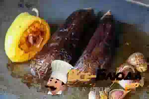 1. Овощи для овощной икры сначала запекают в духовке. Для этого баклажаны вымыть, обтереть досуха бумажным полотенцем, наколоть ножом или вилкой в нескольких местах. Сладкий перец также вымыть. Головку чеснока разобрать на зубчики и каждый зубчик проткнуть ножом. После этого смазать овощи растительным маслом и положить на противень. Запекать до мягкости в прогретой до 200С духовке около 40 минут. Чеснок желательно достать из духовки уже через 20 минут.