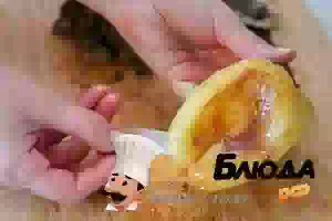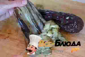 2. Переложить печеные овощи в миску, прикрыть крышкой и дать немного остыть. После этого разрезать баклажаны и ложкой выковырять мякоть. Шкурку выбросить.