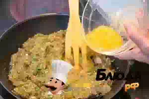 4. В сковороде разогреть растительное масло и выложить овощную икру из печеных баклажанов с перцем. Посолить, поперчить по вкусу, посыпать специями и размешать. Следом перелить чуть взбитое яйцо, приправленное солью. Готовить, размешивая овощную икру, пока не схватится яйцо.