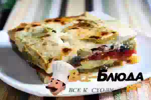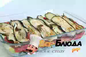 4. Уложить подготовленные овощи слоями, пересыпая каждый слой тертым пармезаном, а помидоры дополнительно посолить и поперчить.