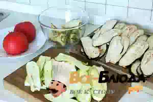 1. Целые перцы примерно одного размера вымыть, вытереть насухо полотенцем, смазать растительным маслом и запекла под грилем, время от времени переворачивая, пока на бочках у перцев не появятся темные подпалины. Пока пекутся перцы нарезать вдоль кабачки и баклажаны, чтобы получились ломтики толщиной примерно 5 мм. Ломтики баклажанов посыпать крупной солью, разложить на доске, сверху положить другую доску и груз. На смазанный растительным маслом противень уложить кабачки и баклажаны. Запекать в прогретой до 200С духовке до образования корочки. Помидоры надрезать, положить их в миску и залить кипятком. Оставить примерно на 10 минут. Затем слить воду и аккуратно снять с помидоров кожицу. Ошкуренные помидоры нарезать кружками.