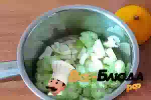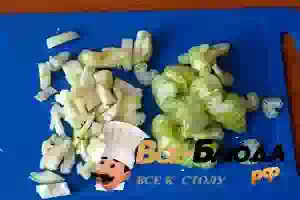 1. Подготовить все ингредиенты для омлета с начинкой. Стебель сельдерея вымыть, очистить от жестких, грубых волокон и порезать тонкими ломтиками. Очищенный лук порубить небольшими кубиками.