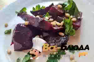 4. Перемешать, сложить в миску, прикрыть пищевой пленкой и поставить в холодильник на несколько часов или на ночь. Чем дольше свекла маринуется, тем вкуснее получится. Маринованную свеклу украсить перед подачей рубленой петрушкой и кедровыми орехами. Овощная закуска готова.