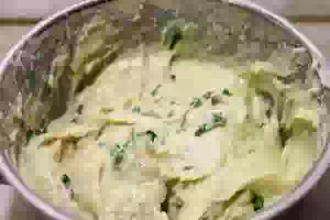1. Картофель очищаем от кожуры, промываем, отвариваем в подсоленной воде до готовности. Жидкость сливаем, она нам не нужна. Разминаем картофель и постепенно вливаем горячее молоко, перемешиваем. Однородное пюре оставляем немного остыть.