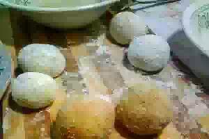 6. Опудрите руки мукой, возьмите столовую ложку картофельной массы, слепите лепёшку. На середину лепешки положите примерно половину чайной ложки начинки, скрепите края, скатайте аккуратный шар.
