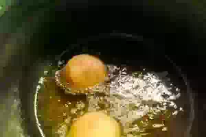 8. В глубокой жаровне предварительно разогрейте растительное масло до 160С. Жарьте крокеты до румяности, периодически переворачивая сухой шумовкой. Извлеките готовые картофельные шарики из фритюра, выдержите пару минут на бумажной салфетке. Подавайте крокеты на стол в горячем виде.