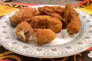 6. Слепленные и обвалянные в муке крокетики я ненадолго убрала в морозильник, чтобы они схватились. Потом взбиваем яйца, насыпаем сухари на тарелку. Разогреваем масло в кастрюльке, где у нас будет фритюр. Подмороженные крокеты обмакиваем в яйцо, обваливаем в сухарях и жарим в масле. Масло должно быть более горячим, чем, скажем, для пончиков, потому что наша задача быстро сделать прочную корочку, чтобы удержать начинку, которая уже готова. Вылавливаем крокеты, обсушиваем от масла на бумажном полотенце и подаем к столу.