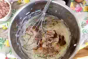 2. Добавить мелко нарезанную ветчину. Попробовать на вкус и добавить соль, перец в зависимости от солености и остроты ветчины.