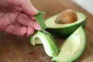 1. Спелый авокадо разрезать вдоль пополам, удалить косточку и аккуратно снять зеленую кожицу.