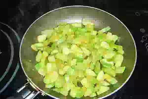 1. Небольшой кабачок с тонкой кожицей моем, режем и припускаем на растительном масле. После по вкусу солим и снимаем с плиты.