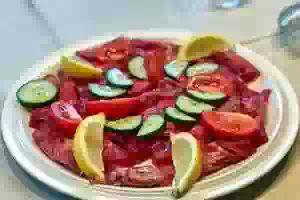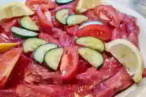 4. Укладываем закусочные рулетики на тарелку, поливаем оливковым маслом, украшаем дольками огурца, помидора и лимона, подаем на стол. Рулетики из брезаолы с творогом готовы.