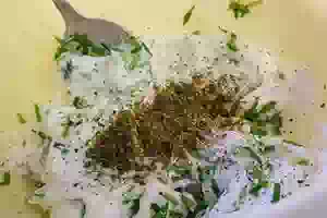 1. Готовим начинку на рулетиков из брезаолы. Перемешиваем творог с мелко нарезанным зеленым луком, приправами и перцем.