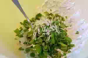 2. Добавляем нарезанный базилик и тертый твердый сыр, перемешиваем.