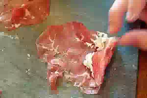3. Для рулетиков потребуется примерно 30 ломтиков тонко нарезанной брезаолы. На каждый ломтик брезаолы кладем 1 ч. л. творожной смеси и заворачиваем.