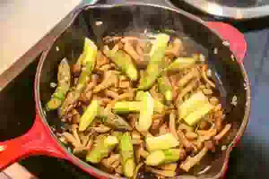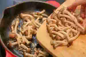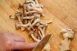 1. Перед обжаркой у шимеджи надо срезать жесткое основание, выбросить его, а остальные грибочки хорошо промыть.