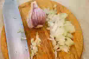 3. Зубчики чеснока придавить плоской стороной лезвия ножа, снять шелуху и мелко порубить каждый. Половинку луковицы мелко нарезать.