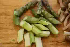 2. У спаржи овощечисткой срезать с побегов грубые волокна, в результате чего буквально у самого основания ростка появится юбочка из этих волокон, которую надо отрезать. Каждый очищенный росток разрезать по длине на отрезки по 2-3 см.