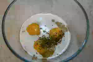 6. В миске слегка размешать вилкой или венчиком яйца с молоком/сливками. Посолить, приправить сушеным тимьяном и молотым черным перцем.
