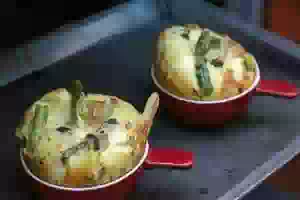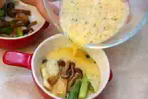 7. Формочки для запекания щедро смазать сливочным маслом. Разложить по формочкам начинку - жареные грибы шимеджи со спаржей.