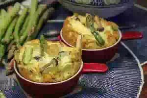 7. Формочки для запекания щедро смазать сливочным маслом. Разложить по формочкам начинку - жареные грибы шимеджи со спаржей.