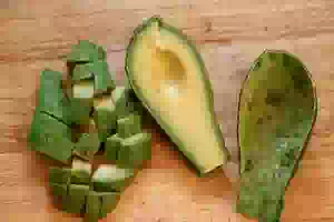 1. Спелое авокадо разрезать вдоль пополам, удалить косточку и аккуратно снять зеленую кожицу. Мякоть авокадо порезать кубиками, сложить в глубокую миску и сразу полить соком лимона, чтобы мякоть сохранила свой яркий зеленый цвет.