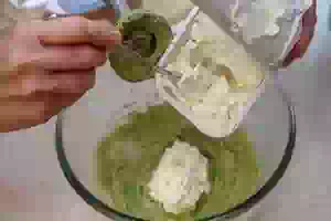 3. Творожный сыр размять вилкой прямо в коробочке и добавить к пюре из авокадо. Взбить эту массу, чтобы она стала напоминать мусс.