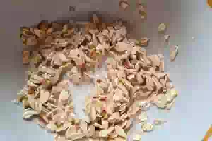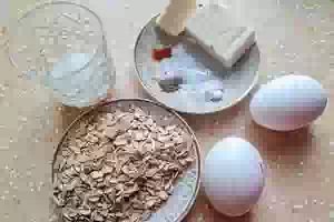2. Овсяные хлопья насыпать в миску и залить теплым молоком. Оставить на 15 минут, чтобы хлопья стали мягче.