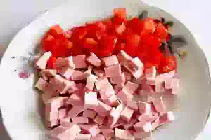 1. Порежьте колбасу и помидоры небольшими кубиками.
